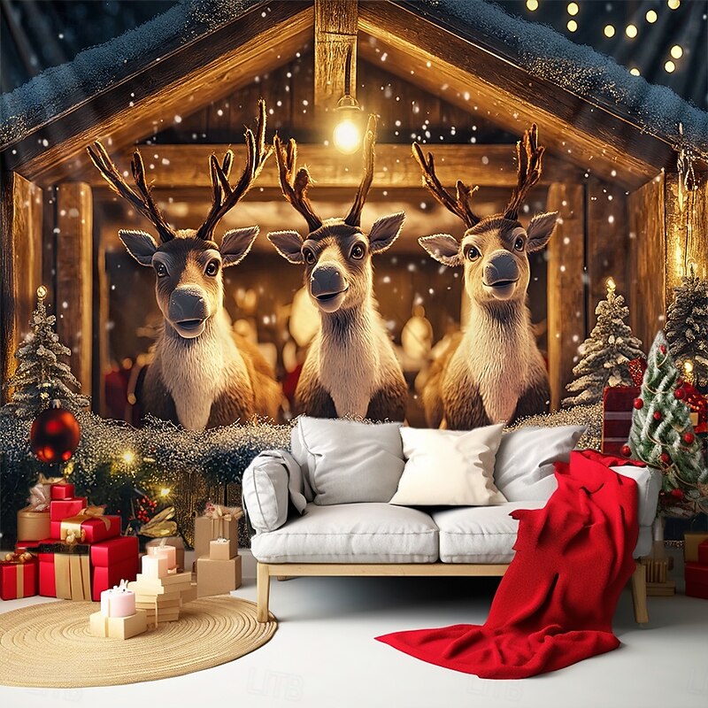 HOT ! Christmas Decorations Hanging Tapestry Wall Art Xmas Deer Farmhouse Large Tapestry Mural Decor Photograph Backdrop Blanket Curtain Home Bedroom Living Room