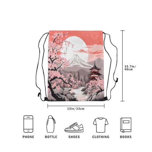 HOT ! jejeloiu Japanese Style Drawstring Backpack 13x15.7inch Cherry Blossom Waterproof Gym Drawstring Bags Japan Fuji Mountain Sports String Backpack Beach Swim Travel Bag Sackpack