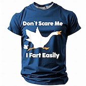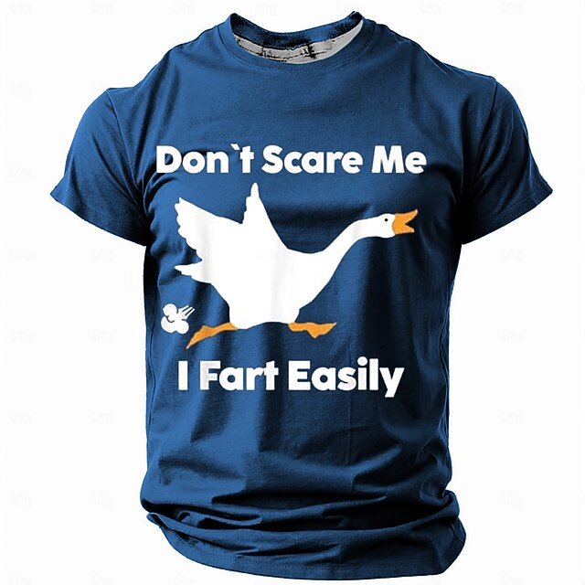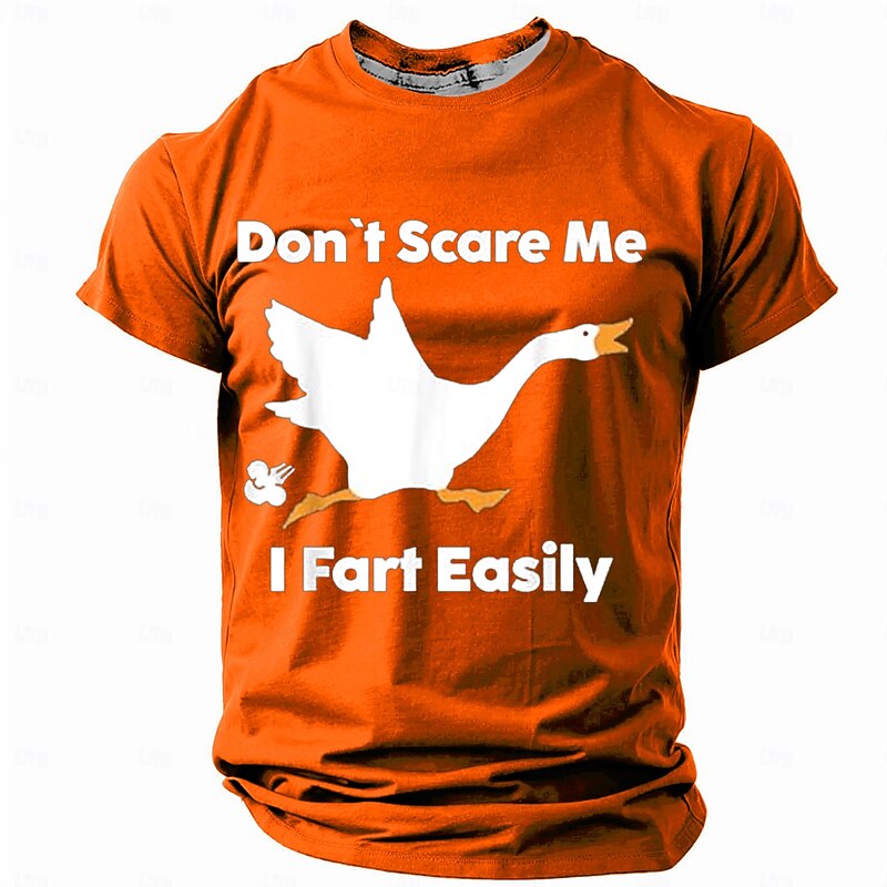 Highlights [Fabric] : Crafted from a high-quality polyester blend, this men's t-shirt offers micro-elasticity for a comfortable, breathable fit, perfect for warm spring and summer days. [Fit] : Designed with a regular fit, this crew neck t-shirt provides a relaxed and classic silhouette, making it ideal for everyday wear. [Design Highlights] : This t-shirt features a humorous 3D print of a white swan accompanied by the quirky text "Don't Scare Me, I Fart Easily" on the front. The playful design is set against vibrant color options of black, blue, and orange, adding a fun and unique touch to your casual attire. [Occasions] : Suitable for a variety of activities such as street sports, outdoor adventures, or casual outings, this t-shirt effortlessly blends style and humor, making it a perfect choice for individuals with a fun-loving personality. [Size Range] : Available in a wide range of sizes from S to 3XL, ensuring a great fit for adults of all body types.
