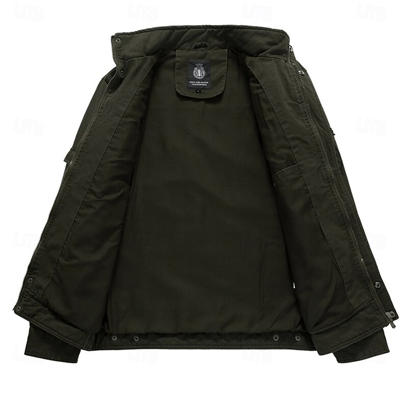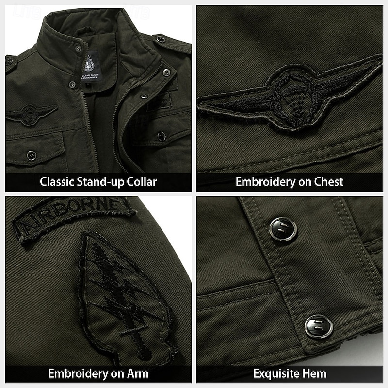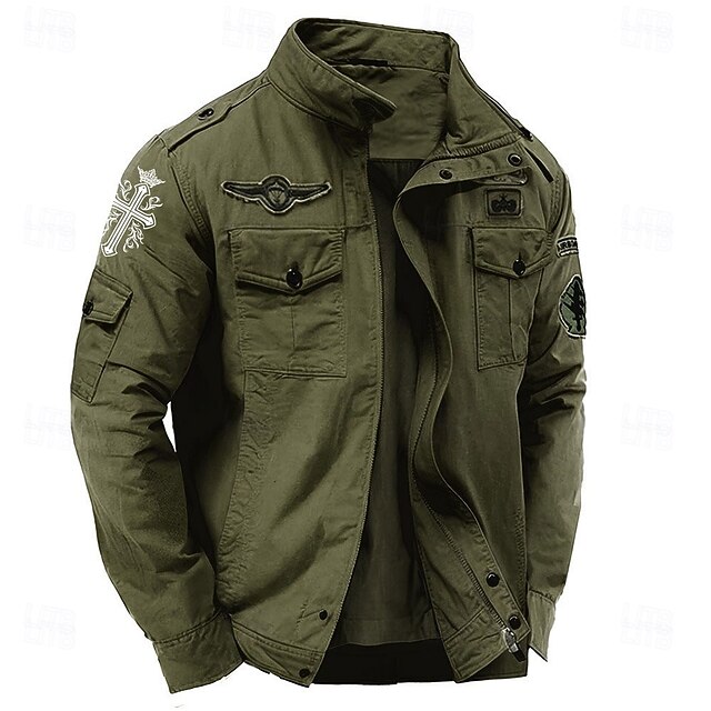 Men's Cotton Embroidered Military Jacket Windbreaker with Shoulder Straps Long Sleeve Standing Collar Multi-Pockets Trucker Jacket Cross Print Tactical Outerwear 10