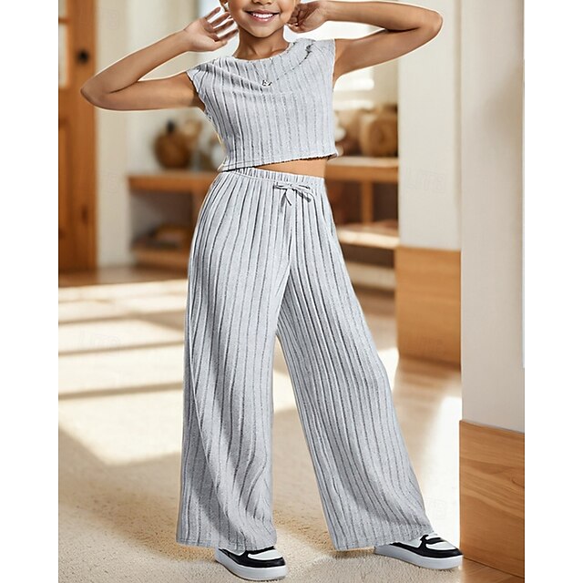 2 Pieces Kids Girls' Solid Color Crewneck T-shirt & Pants Set Short Sleeve Fashion Outdoor 4 years+ Summer Light Grey 7