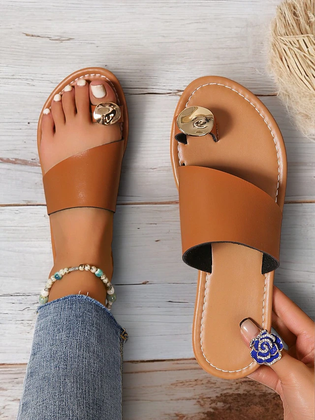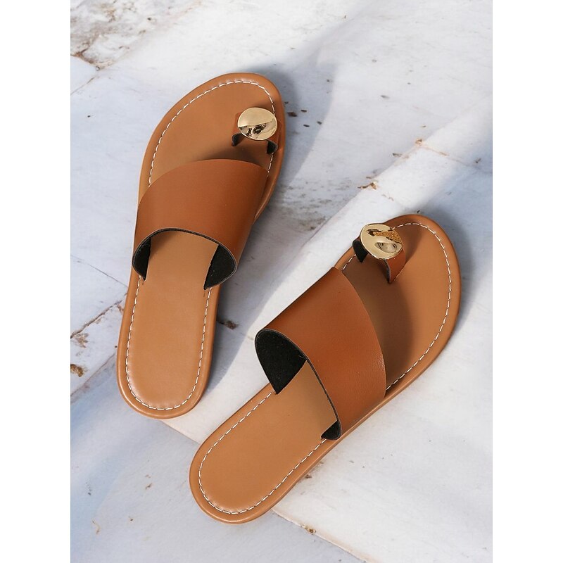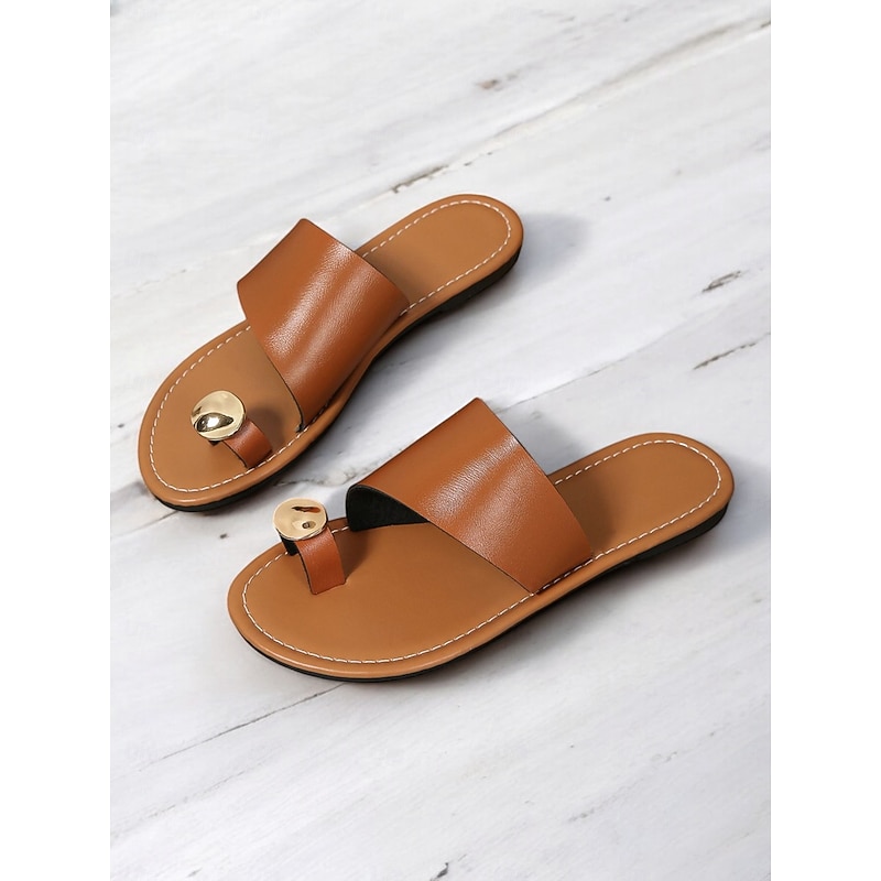 HOT ! Women's Brown Slip-On Toe Ring Sandals with Gold Accent, Minimalist Flat Slides for Casual Summer and Beach Wear