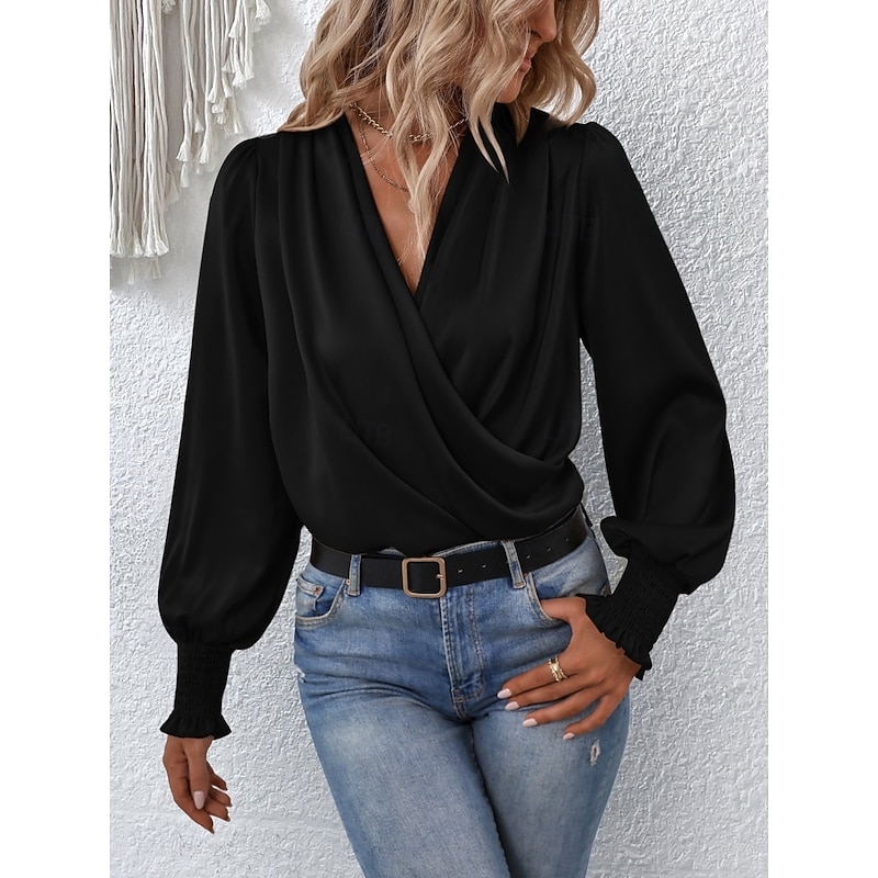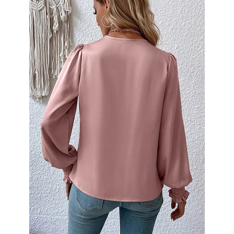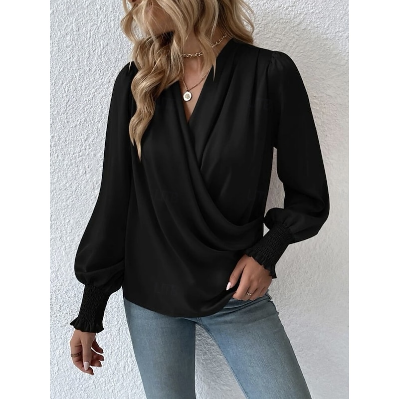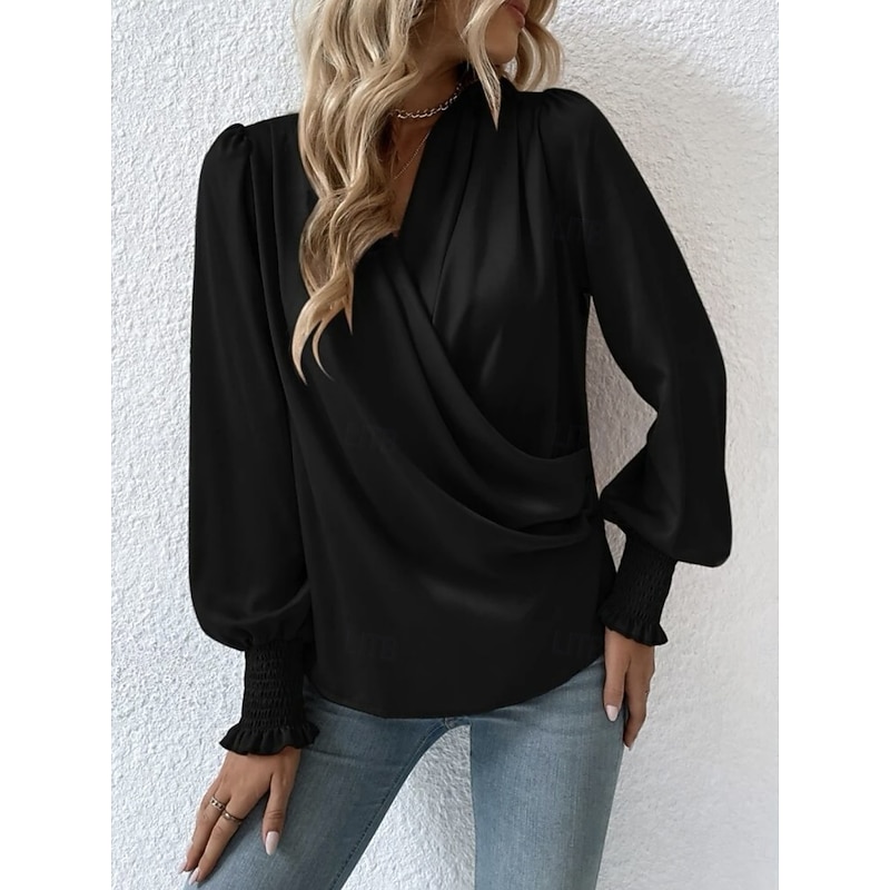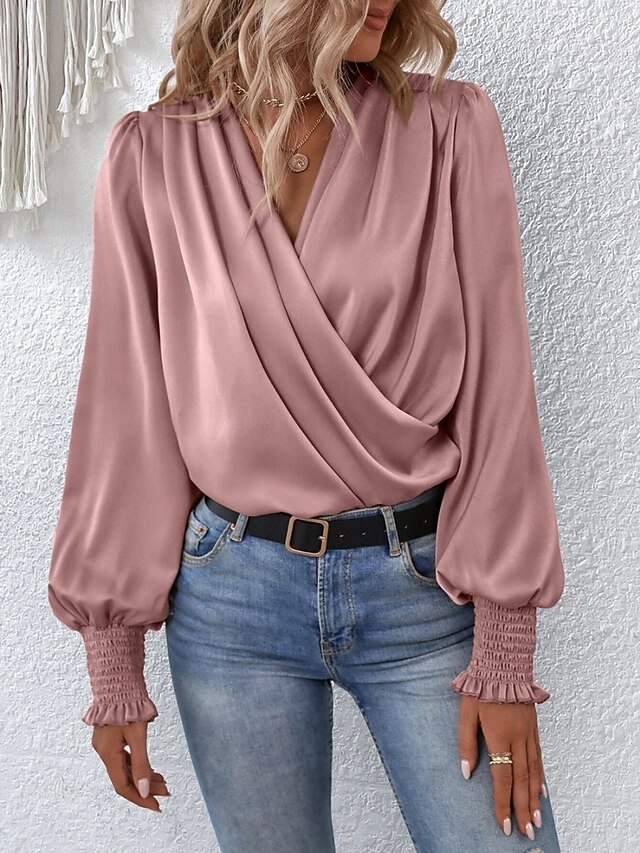 More information about Women's Shirt Elegant Dressy Satin Solid Color Business Modern Casual Long Sleeve V Neck Regular Tops Work Formal Wear Ruched Black Pink Summer Spring
