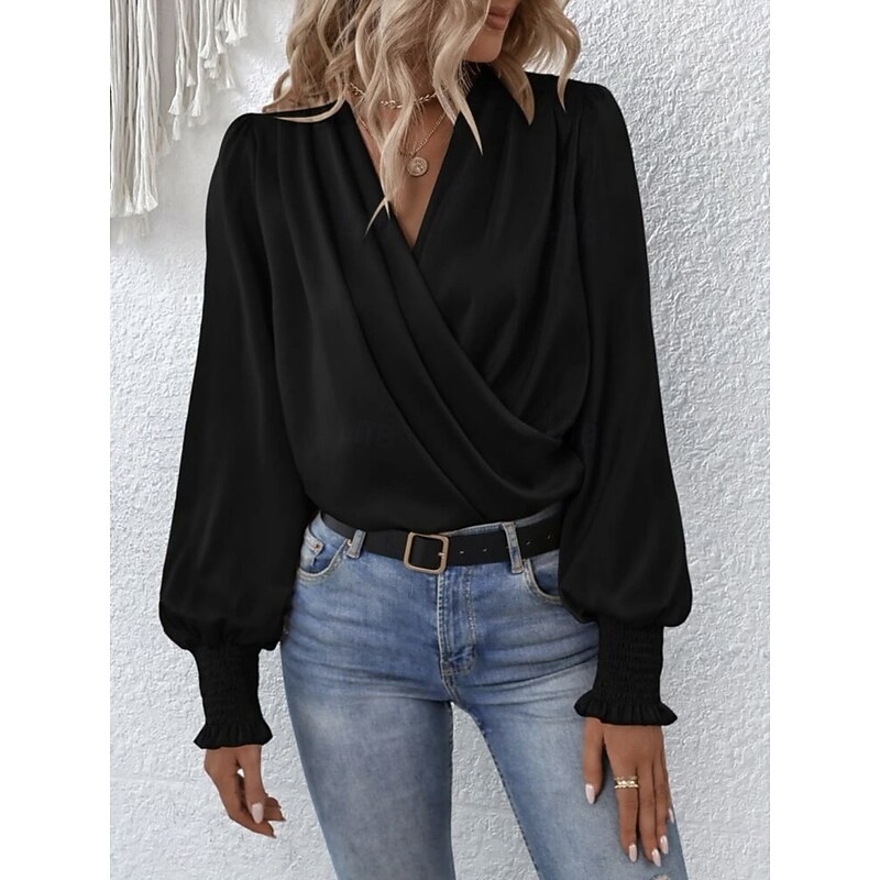 HOT ! Women's Shirt Elegant Dressy Satin Solid Color Business Modern Casual Long Sleeve V Neck Regular Tops Work Formal Wear Ruched Black Pink Summer Spring