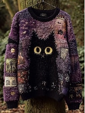 More information about Halloween Women's Sweater Black Cat Print Cute Streetwear Casual Graphic Animal Crew Neck Patchwork Knitted Long Sleeve Regular Tops Knit Work Purple Orange Fall Winter