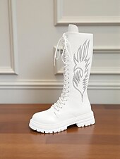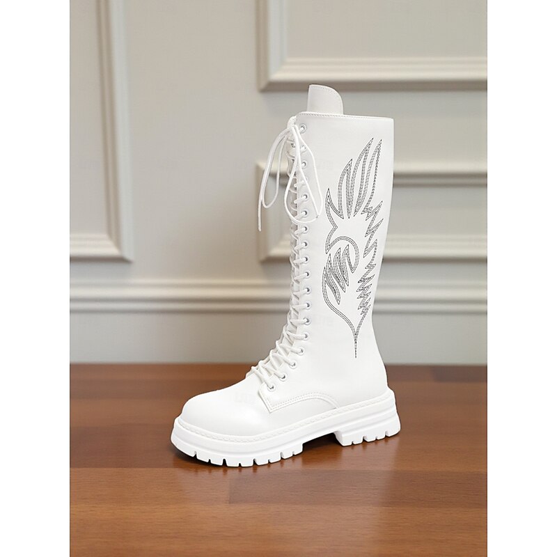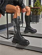 HOT ! Women's Black Knee-High Lace-Up Combat Boots with Chunky Soles and Unique Embroidered Design, Stylish Urban Fashion Footwear