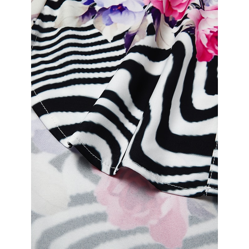 The dress showcases a stylish shirt collar and a button-down front, complemented by long sleeves that can be rolled up for added versatility. The high-low hem design adds a contemporary flair, while the vibrant floral and striped patterns bring an eye-catching pop of color.