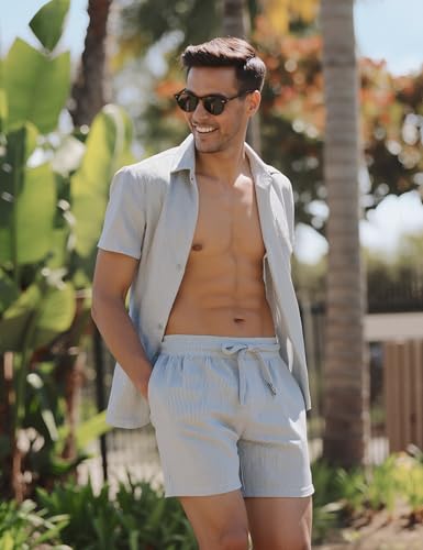UOUA 2 Piece Short Sets for Men Summer Beach Outfits Stripe Texture Button Down Shirts & Shorts Casual Vacation Set 6