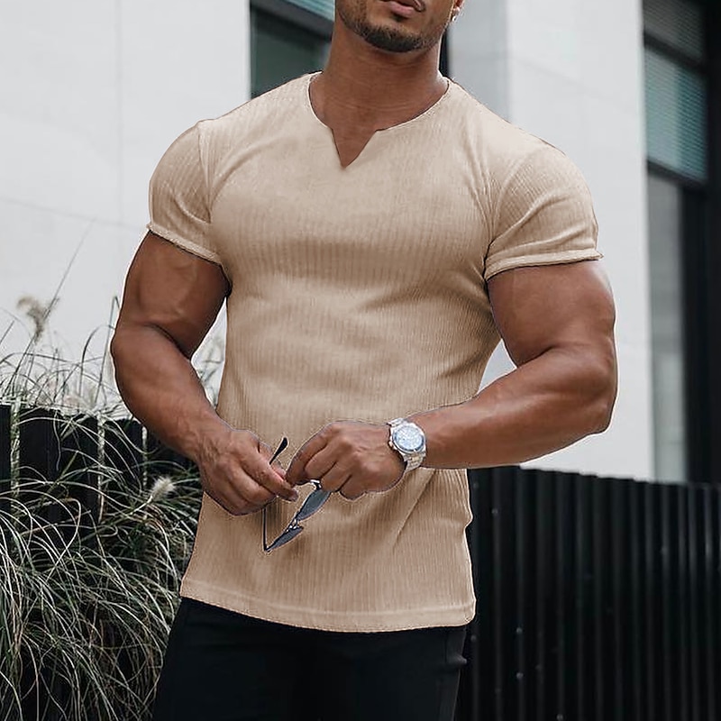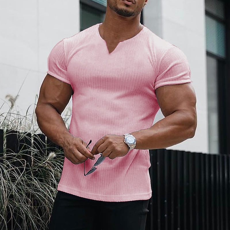 Highlights [Fabric and Fit] : Crafted from a premium ribbed cotton blend, this men's T-shirt offers a perfect balance of comfort and stretch. The micro-elasticity of the fabric allows for a snug yet flexible fit, accentuating the muscular physique while providing ease of movement. [Design Highlights] : The T-shirt features a sleek V-neck, adding a stylish touch to its casual appeal. Its minimalist print enhances the plain design, making it a versatile addition to any wardrobe. The short sleeves and breathable fabric make it an excellent choice for warm weather, ensuring you stay comfortable and cool. [Occasions] : Ideal for a variety of casual settings, this T-shirt effortlessly transitions from streetwear to holiday outings, sports activities, and relaxed weekends. Whether hitting the gym or enjoying a laid-back day, its fashionable yet comfortable design suits multiple scenarios. [Size Range] : Available in six versatile colors—Blue, White, Black, Pink, Gray, and Khaki—and a wide range of sizes from S to 3XL, catering to different preferences and body types. Perfect for adults seeking both style and a comfortable, regular fit.