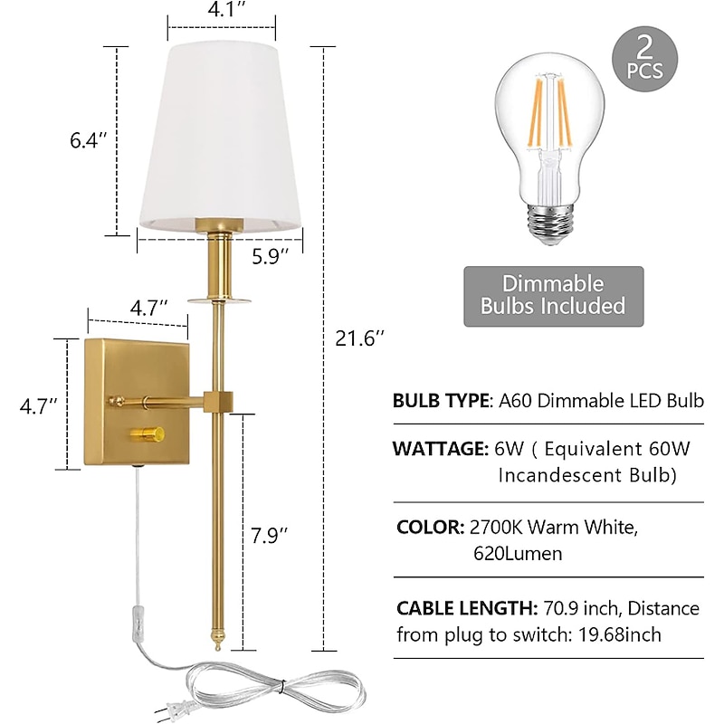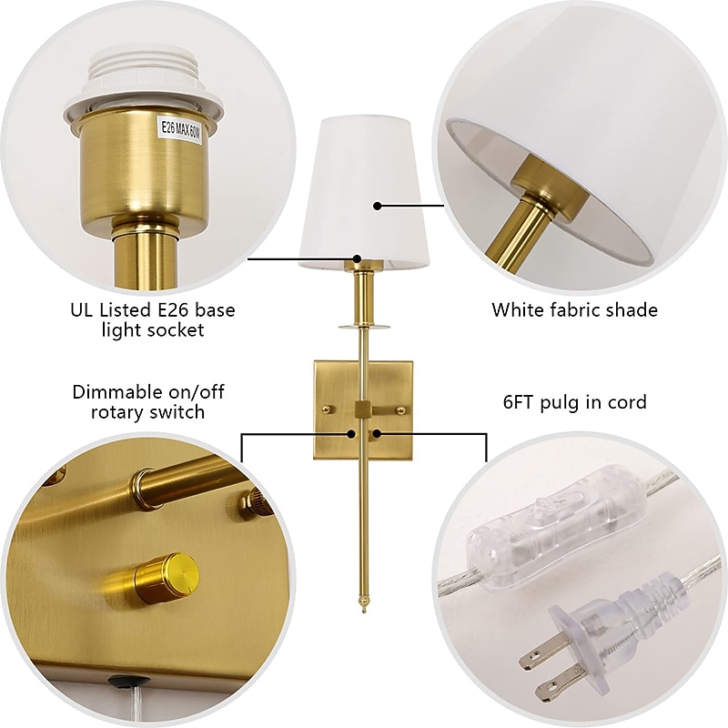 Plug in Wall Sconce Dimmable Wall Sconces 1pcs, White Fabric Shade Wall Lamp with 6Ft Plug in Cord, Indoor Wall Lights Wall Mounted Light Fixture, for Bedroom Living Room Hallway, Gold 11