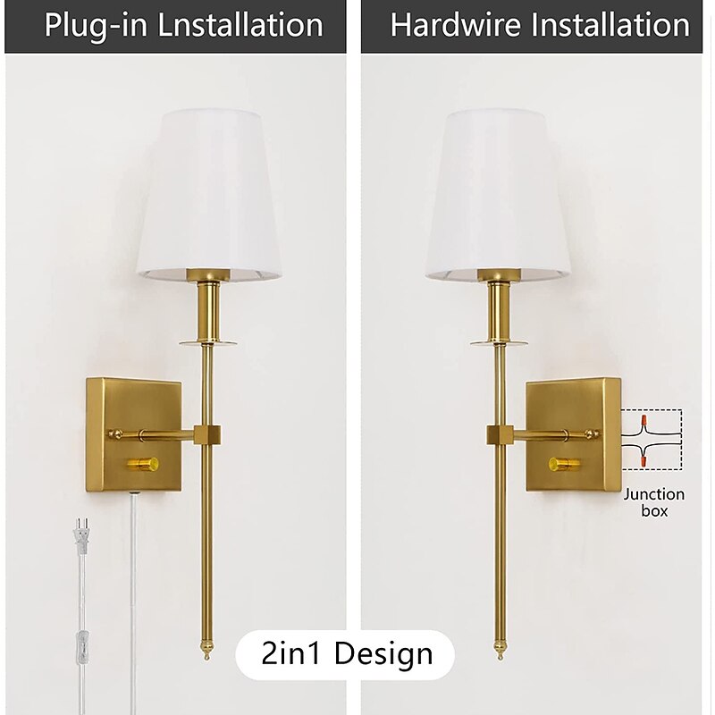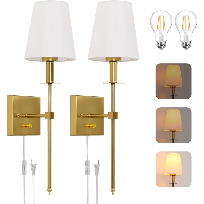 HOT ! Plug in Wall Sconce Dimmable Wall Sconces 1pcs, White Fabric Shade Wall Lamp with 6Ft Plug in Cord, Indoor Wall Lights Wall Mounted Light Fixture, for Bedroom Living Room Hallway, Gold