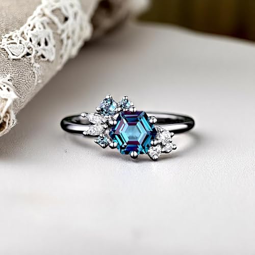 "Vintage Hexagon Cut Alexandrite Ring: Color-Changing Engagement & Moissanite Band Set in Gold/Silver, Art Deco Cluster Bridal Jewelry Gift 6