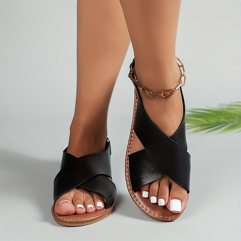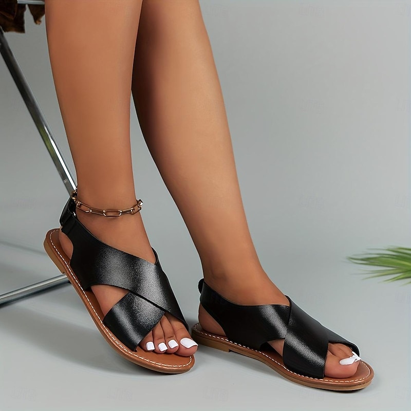 Highlights [Material] : Crafted from premium PU leather, these women's sandals offer a soft and durable texture, ensuring comfort throughout the day. The high-quality faux leather comes in elegant black and warm dark brown shades, adding a touch of sophistication to any summer look. [Silhouette] : These summer sandals feature a flat sole, perfect for all-day comfort and effortless walking, ideal for casual outings or leisurely days at the beach. Designed with a minimalist profile, they seamlessly blend with casual and semi-formal outfits. [Design Highlights] : Highlighting a stylish crisscross open-toe design, these sandals feature a unique slingback closure for easy wear. The sandals also have a round toe shape, providing ample space and breathability for your feet. [Occasions] : Perfect for a variety of summer activities, these sandals are suitable for outdoor events, relaxed beach days, or casual evenings. Their versatile style makes them a staple for warm-weather wardrobes. [Size Notice] : Available in a range of sizes, from US5.5 (EU35) to US10.5 (EU42), allowing a suitable fit for different foot sizes. Please refer to the size chart to ensure the correct fit before ordering.