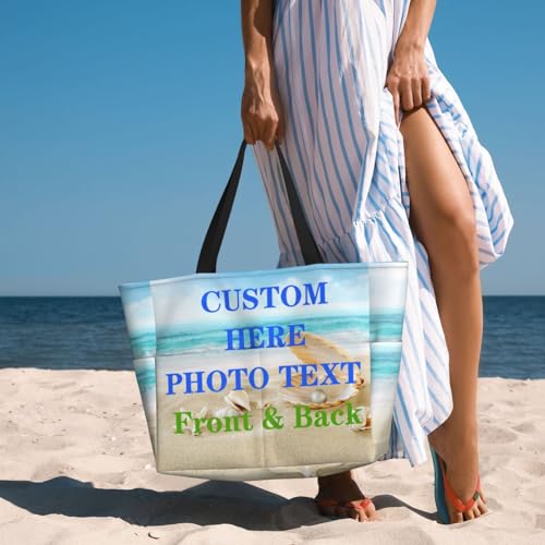 HOT ! Personalized Tote Bags for Women Custom Tote Bag with Zipper Customized with Your Photo Picture Name Text for Shopping Travel Beach, Water Resistant, Large