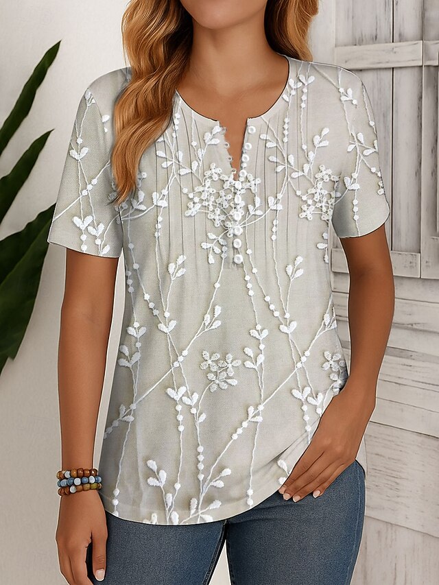 Women's T Shirt Floral Graphic Vintage Stylish Classic Short Sleeve Round Neck Regular Tops Daily Weekend Beach Wear Smocked Buttons Print Blue off-white Summer Spring 2