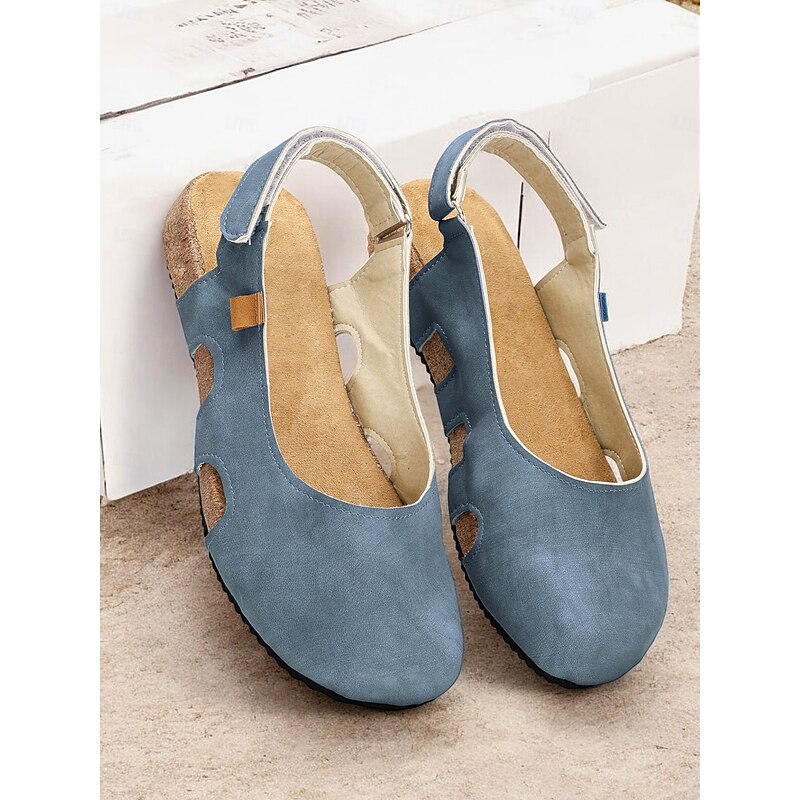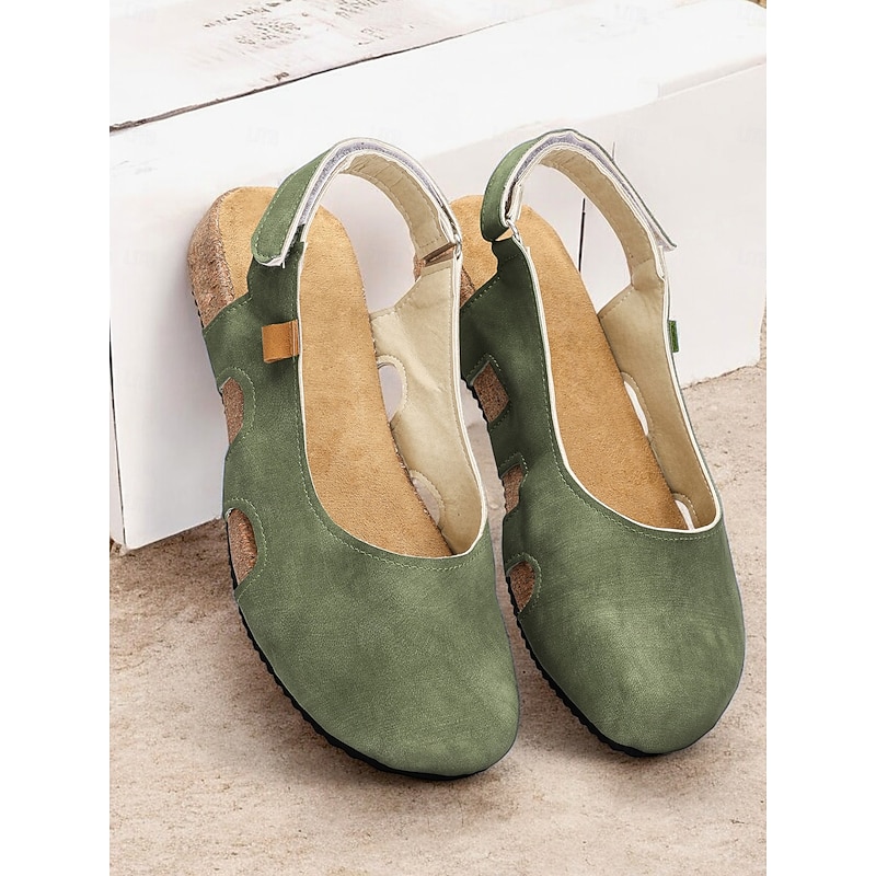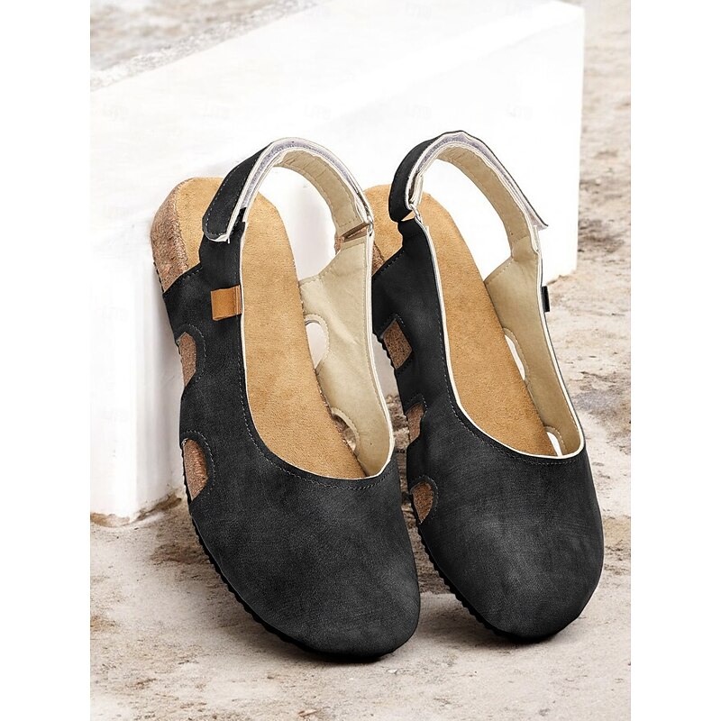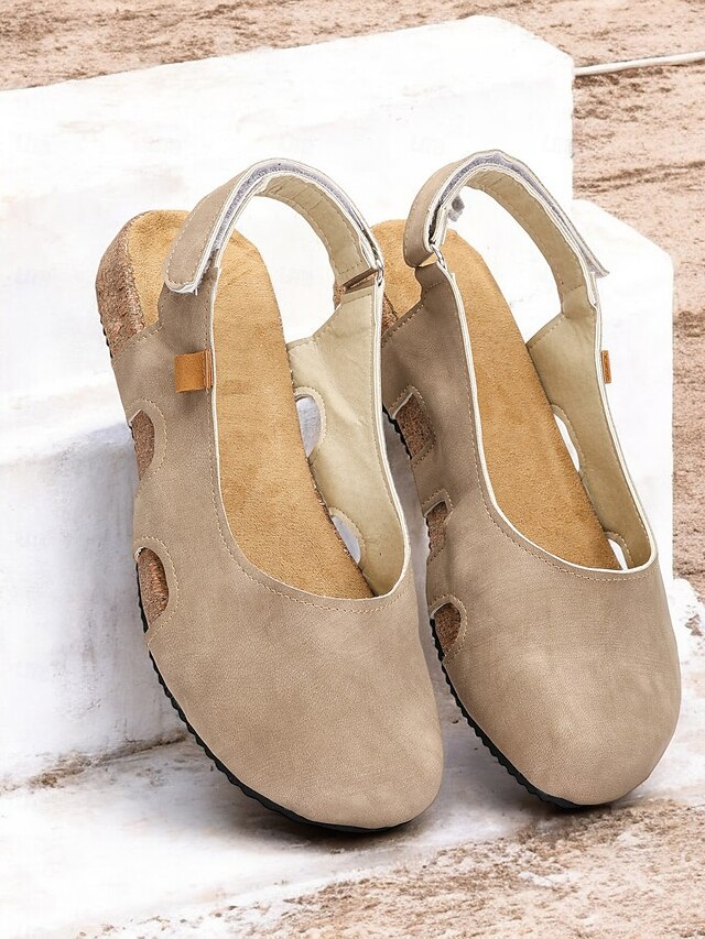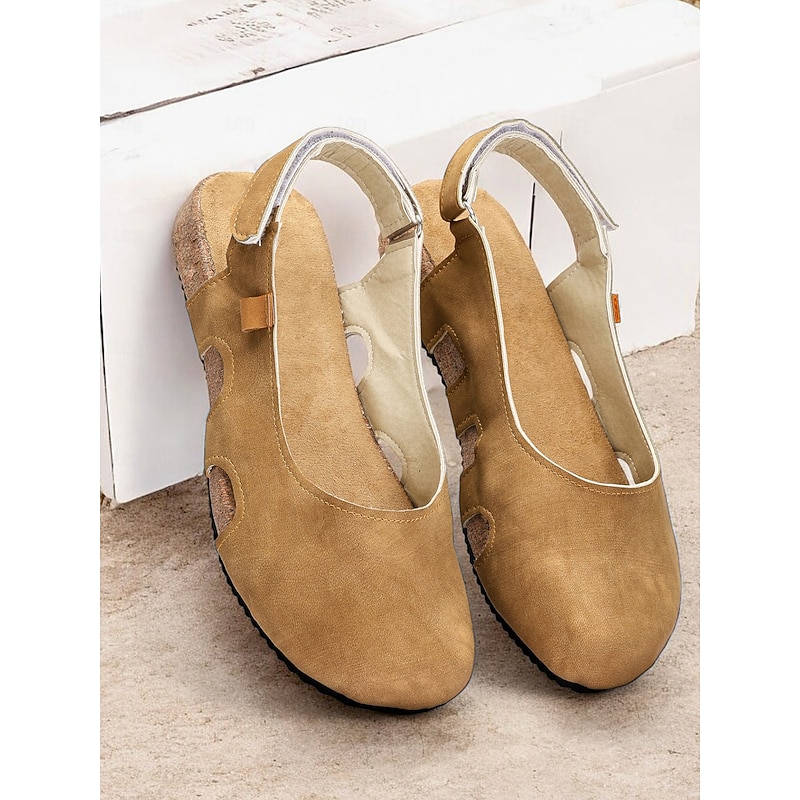 Highlights [Fabric] : Crafted from high-quality faux leather, the upper part of these women's sandals is paired with a synthetic leather lining, offering a soft and breathable experience. This combination ensures both comfort and durability, ideal for long summer days. [Silhouette] : Featuring a flat heel design, these sandals provide all-day comfort without sacrificing style. The casual and comfortable style is perfect for a variety of occasions, ensuring your feet remain relaxed and supported. [Design Highlights] : The sandals boast a trendy slingback strap for secure fitting, complemented by a chic cut-out design on the side. This not only adds a fashionable flair but also enhances air circulation around the foot, making it perfect for warm weather. The cork sole adds a touch of vintage style, combining aesthetics with function. [Occasions] : These sandals are versatile enough to be worn for a variety of outdoor activities or simply at home. Whether you're enjoying a casual day out or relaxing at home, their stylish and practical design makes them a great choice for spring and summer. [Size Range] : Available in a comprehensive range of sizes, from US5.5 to US10.5, ensuring you find the perfect fit. Please refer to the size chart to make an informed purchase. This refined description brings together key product features, designed for versatile summer styling and comfort.