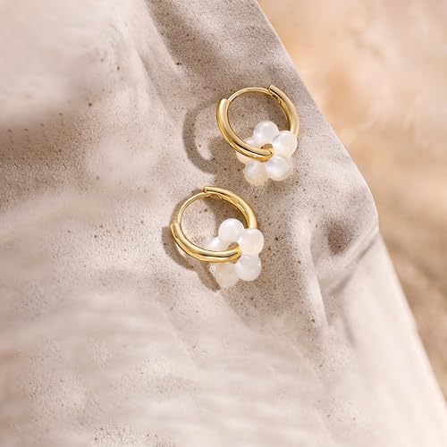 Gold Pearl Earrings For Women, 14K Gold Plated Pearl Drop Dangle Huggie Hoop Flower Earrings, Hypoallergenic Dainty Gold Earrings for Women Trendy Wedding Brides Jewelry Gifts 6
