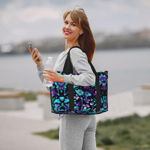 purple and teal flower print Travel Duffel Bag,workout duffel bag, overnight shoulder Bag,Weekender Bag for Women Men 1