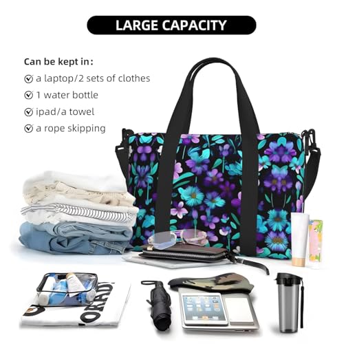 • Versatile Usage: This purple and teal flower print bag is more than just a duffel. It's the perfect carry-on bag for air travel, a weekender bag, an overnight bag, a gym bag, a yoga bag, a workout bag, and more.