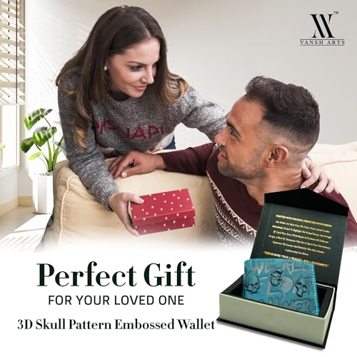 Leather Wallets For Men- 3D Embossed Skulls Pattern Design Bifold Vintage Distressed Genuine Leather Wallet With Two Cash Pockets And Six Card Slots (Blue) 3