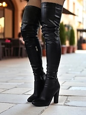HOT ! Women's Black Faux Leather Over-the-Knee Boots - High Block Heel, Side Zipper, Chic Street Style Winter Footwear for Daily, Nights Out and Fashion Events