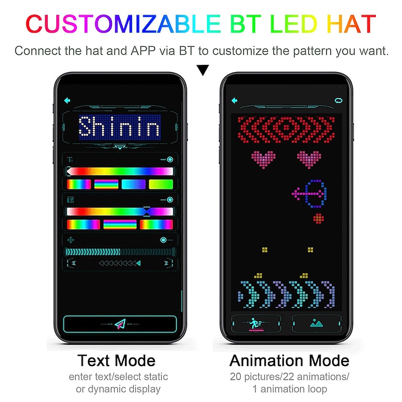 Highlights Product Selling Points: 1. Create a personalized mood: This customizable BT LED hat is perfect for setting a romantic or fun atmosphere on various occasions. 2. Customizable pictures and animations: With 20 pictures and 22 animations, you can easily customize the displayed patterns on the hat surfaces via the accompanying APP. 3. Easy connectivity: Connect the hat to the APP via BT (Bluetooth) to customize the desired patterns. 4. Premium material: Made with high-quality cotton, this hat offers a cozy and comfortable fit, suitable for everyday wear. 5. DIY image creation: Choose your preferred color, light up the lamp beads on the hat, and draw any patterns you desire. The hat will display your creations in real-time and allow for easy editing and saving. 6. Music Rhythm Mode: In this mode, the hat can synchronize with external sounds, creating various lighting effects to match the rhythm. 7. Versatile use: Perfect for Halloween parties, family gatherings, stage performances, and graduation parties, this LED hat is an excellent tool for creating a special atmosphere. It also makes for a unique and creative gift for your loved ones.