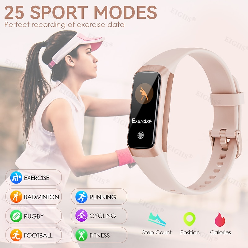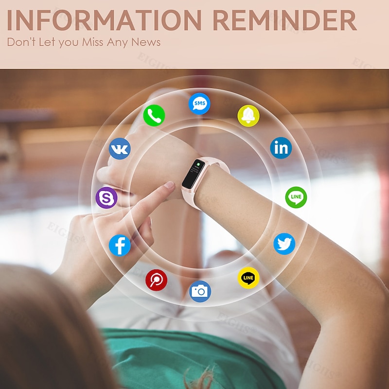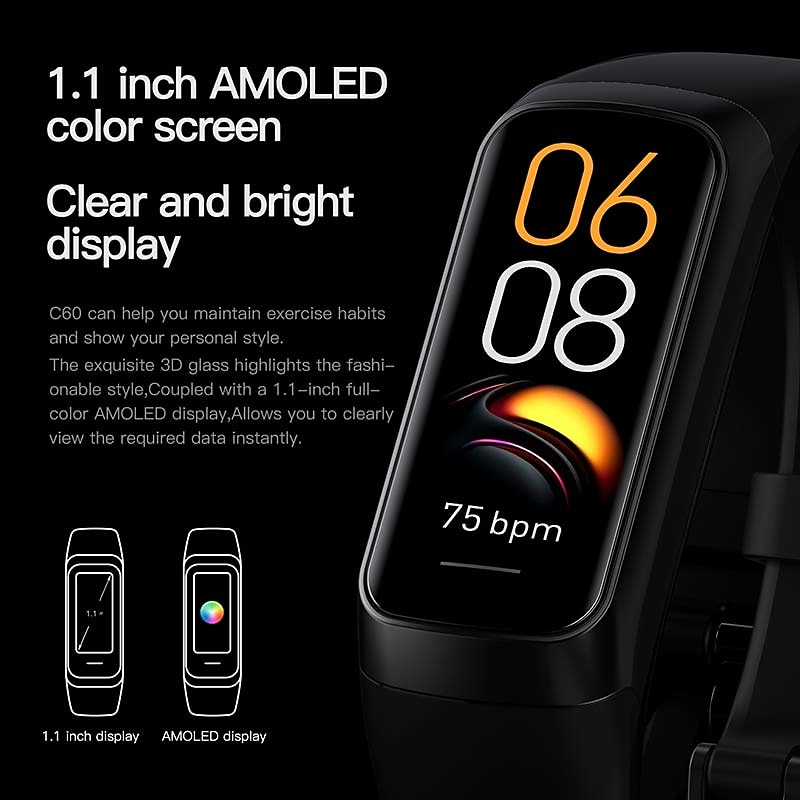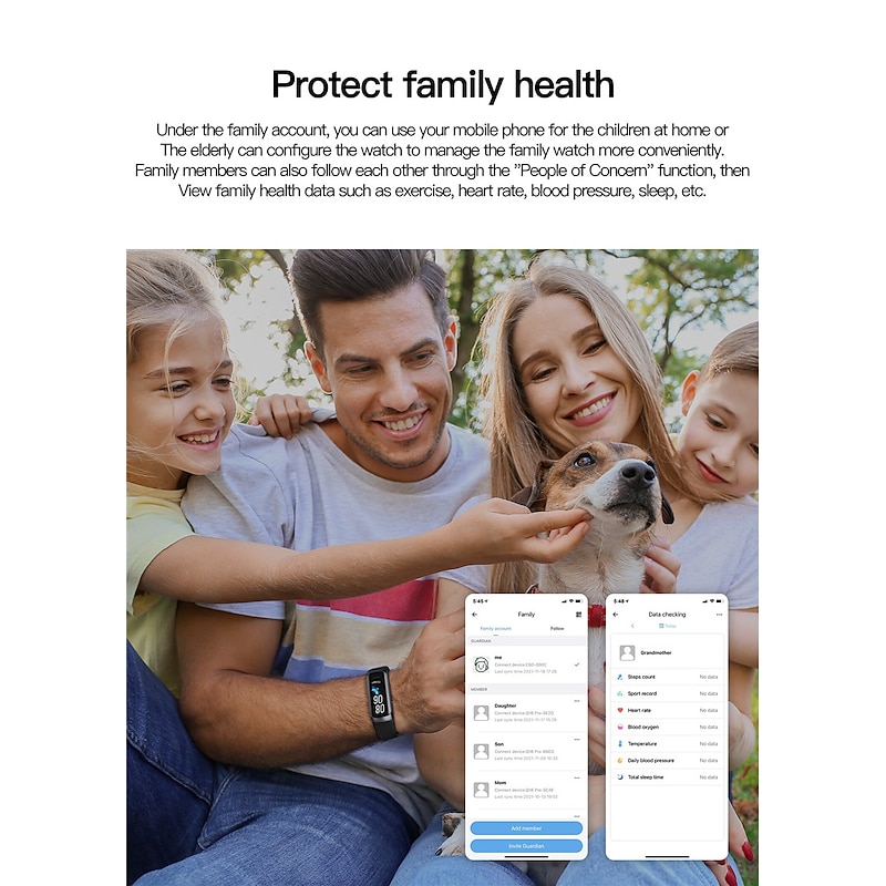 Highlights 1. Daily activity record: - Keep track of your daily steps, calories burned and distance covered. - Monitor your progress in 25 different sports modes, including walking, running, football, hiking, and more. 2. Health monitoring: - Stay on top of your health with 24-hour heart rate, blood pressure and oxygen monitoring. - Track your sleep patterns for a better understanding of your sleep quality. 3. Smart reminder: - Never miss an important call, email or message with real-time notifications from multiple platforms. - Receive alerts for social media updates on QQ, WeChat, WhatsApp, Facebook, Twitter, and more. - Stay active and avoid a sedentary lifestyle with reminders to move, drink water and achieve your goals. - Get notified when your device has low battery to ensure uninterrupted usage. 4. More functions: - Start your day right with the alarm clock function. - Customize the watch face to match your personal style. - Block distractions with the do not disturb mode. - Simply rotate your wrist to wake up the screen. - Control your phone's camera from your wrist. - Keep track of your family's health with smart features. - Use the stopwatch for workouts and timing activities.