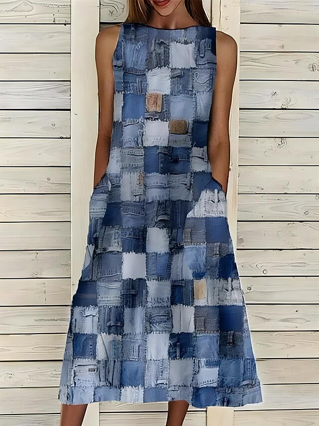 Women's Midi Dress Sundress A Line Dress Summer Dress Vacation Casual Cocktail Daily Holiday Summer Dress Regular Fit Graphic Geometric Sleeveless Crew Neck Navy Royal Blue Blue Sky Blue Summer 2