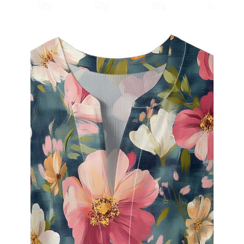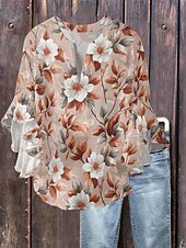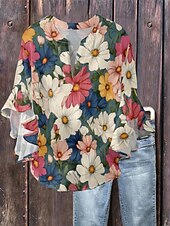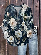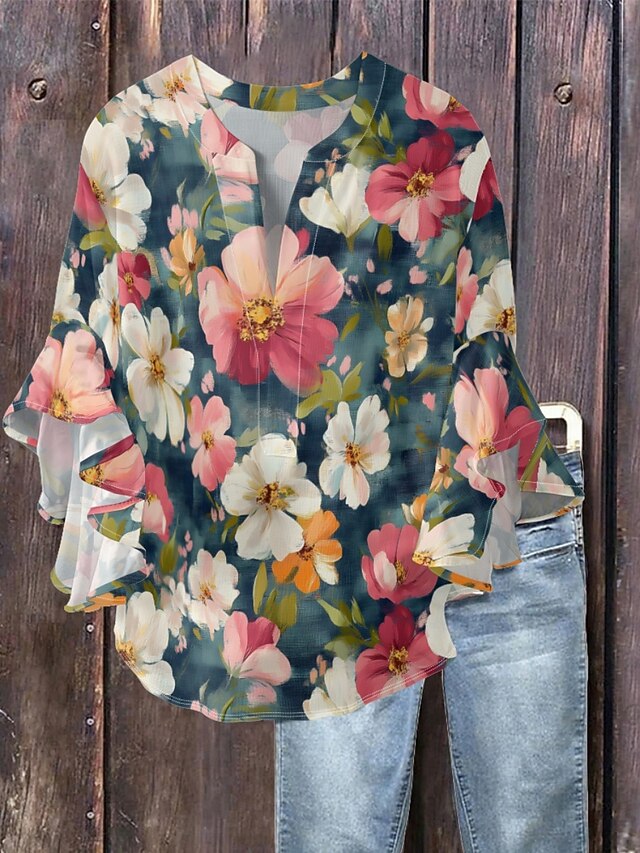 More information about Women's Blouse Floral Stylish Modern 3/4 Length Sleeve V Neck Regular Tops Daily Holiday Ruffle Print Grass Green Pink Navy Blue Green Summer