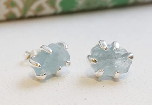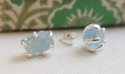 HOT ! Raw Aquamarine 6-8mm Sterling Silver Stud Earrings for Women - Hypoallergenic Handmade Blue Gemstone Gem Birthstone Jewelry - Birthday Gift Ideas for Women -Valentine's Day Gift (sterling-silver)