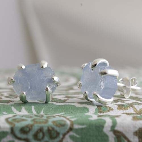 Raw Aquamarine 6-8mm Sterling Silver Stud Earrings for Women - Hypoallergenic Handmade Blue Gemstone Gem Birthstone Jewelry - Birthday Gift Ideas for Women -Valentine's Day Gift (sterling-silver) 9