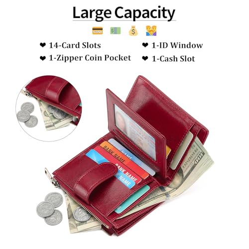 • Compact & Organized: 14 RFID card slots, 1 ID window, 1 side zipper pocket for coins/keys, and 1 full-length bill compartments, this small wallet for women can hold your daily essentials