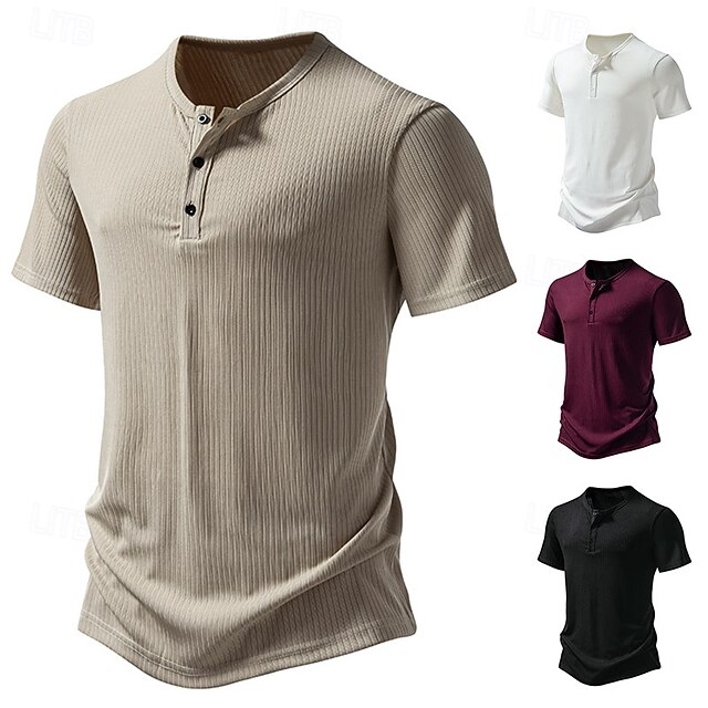 More information about Men's Henley Shirt Tee Rib Knit Top Muscle Shirt Short Sleeve Solid Color Plain Casual Buttons Henley Outdoor Casual Daily Summer Spring & Fall Black White Burgundy Henley T-Shirt