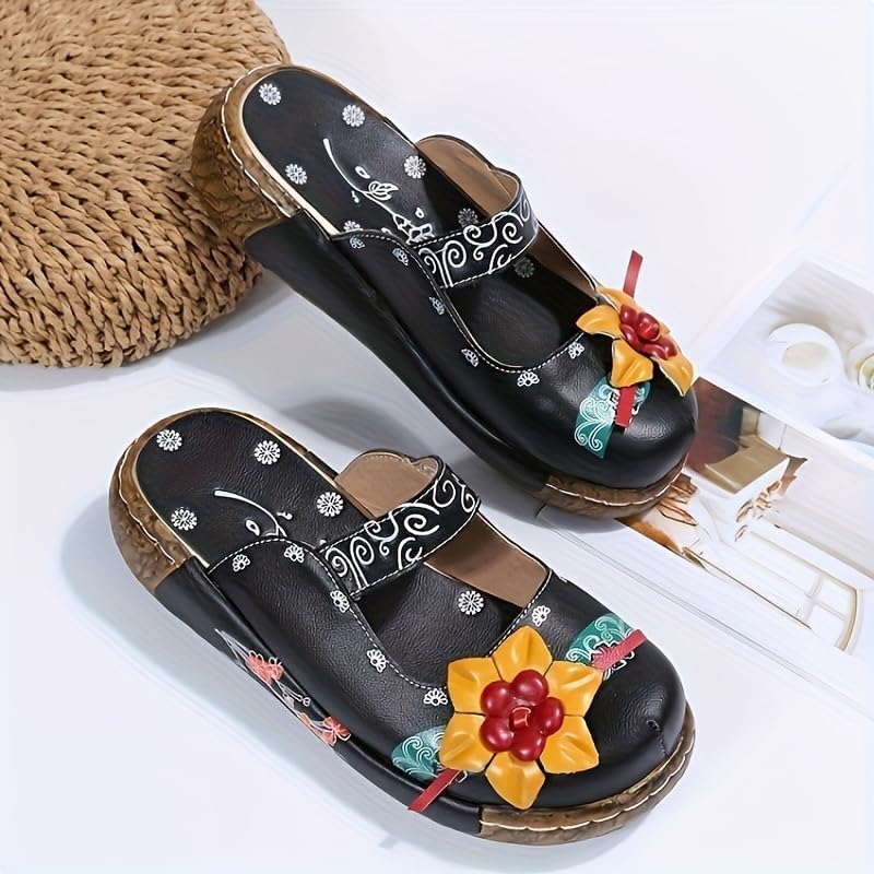 Women's Tribal Flower Platform Mules - Closed Toe Wedge Slides Sandals 4