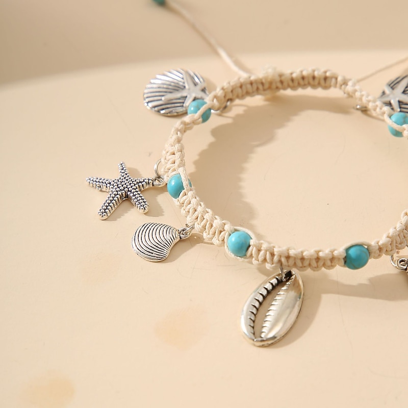 Highlights [Fabric] : Crafted with a delicate woven macramé band, this anklet is made from natural cotton thread, ensuring both softness and comfort for all-day wear. The use of high-quality alloy in the metallic charms adds durability and a touch of elegance to the piece. [Style] : This beach-themed anklet features a retro-inspired design that combines the artistic and casual sporty style, making it a versatile accessory. Its graceful and elegant appearance pairs well with both casual and chic summer outfits, adding a subtle yet eye-catching charm. [Design Highlights] : Adorned with sea-inspired charms including a starfish, seashells, and a cowrie shell, the anklet is decorated with vibrant turquoise beads that offer a refreshing splash of color. The intricate detailing of the metallic charms provides a bohemian allure, perfect for those who love coastal vibes. [Occasions] : Ideal for a variety of occasions such as evening parties, casual day events, holidays, and beach outings, this anklet adds a playful yet sophisticated touch to your ensemble. Whether you're attending a daytime gathering or an evening date, it's an accessory that complements any occasion. [Size Notice] : Available in a universal size, this anklet ensures a comfortable fit for most, making it suitable for everyday wear or special events. The flexible package ensures that the anklet arrives in excellent condition, ready to wear upon delivery.