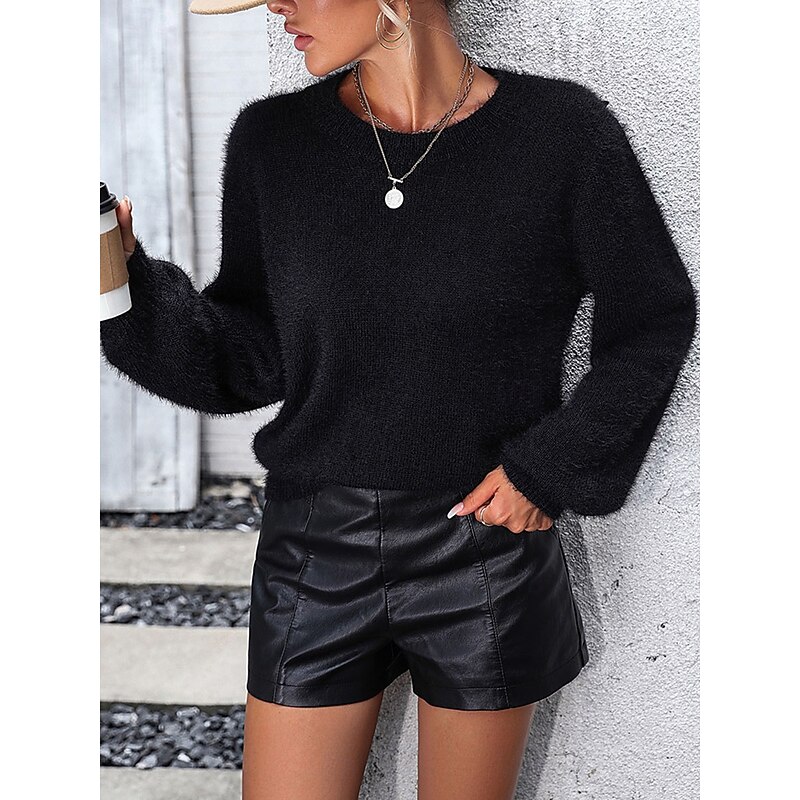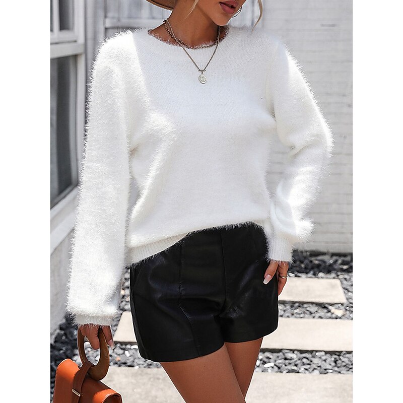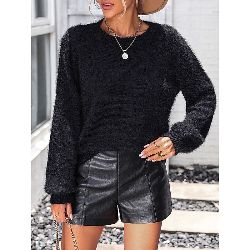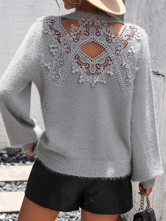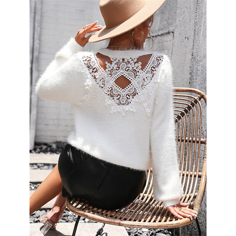 More information about Women's Sweater Casual Soft Pure Color Ribbed Crew Neck Lace Patchwork Knitted Long Sleeve Regular Tops Knit Outdoor Daily Weekend Black White Fall Winter