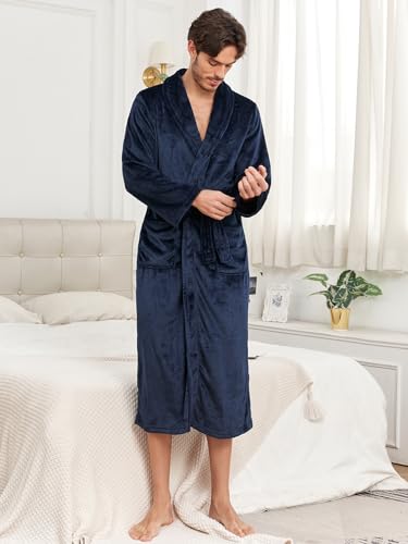 Why Choose RONGTAI Bathrobe for Men, Long Shawl Collar Robe, Plush Fleece Fabric, Side Pockets, comfortable and Cozy Sleepwear (Navy, S), Small?