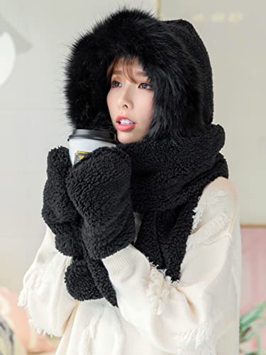 Women's Faux Fur Furry Hood Hat Scarf Gloves 3-in-1 Warm Plush Earflaps Hoodie Cap Fur Collar Winter Hat 3