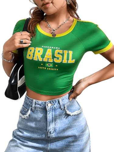 Women's Letter Graphic Round Neck Contrast Binding Crop Tee Short Sleeve Slim Fit Pullover T Shirt Green Medium 7