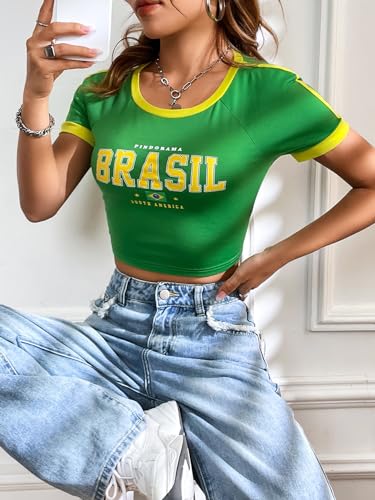 HOT ! Women's Letter Graphic Round Neck Contrast Binding Crop Tee Short Sleeve Slim Fit Pullover T Shirt Green Medium