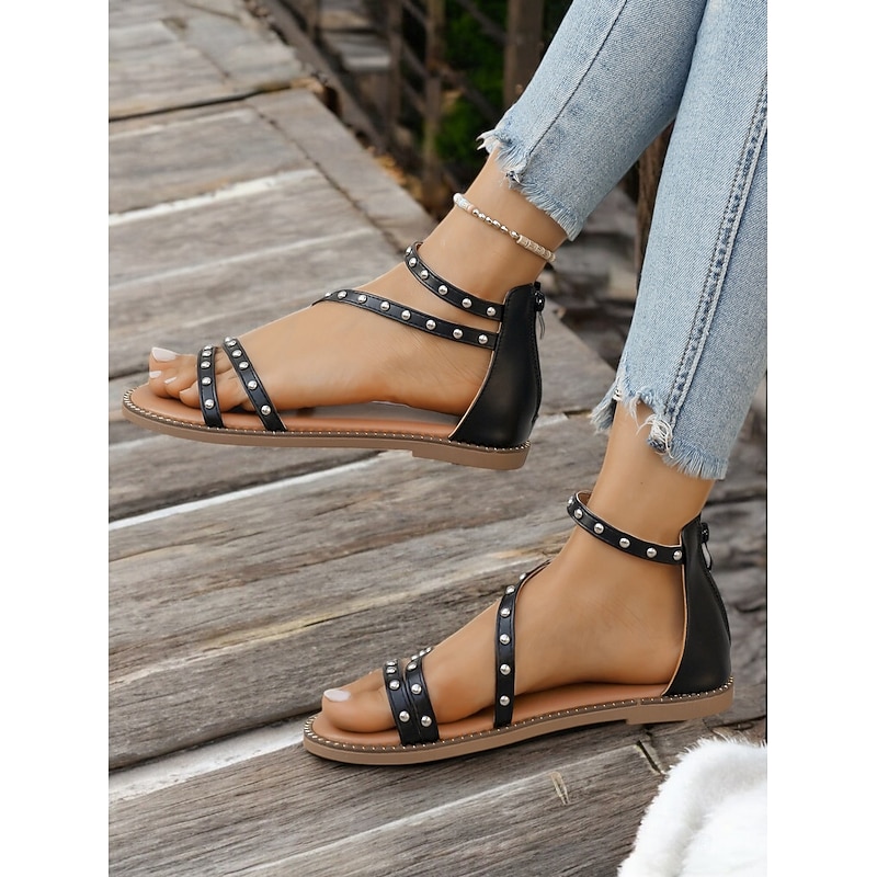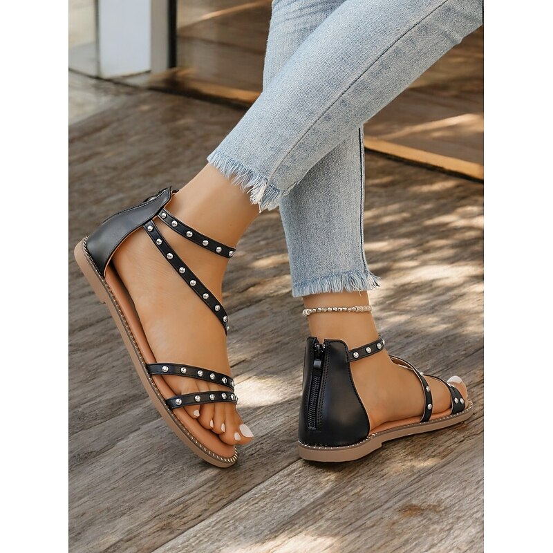 HOT ! Women's Studded Gladiator Sandals – Black Strappy Flat Sandals with Rivet Details for Summer, Casual and Beach Wear