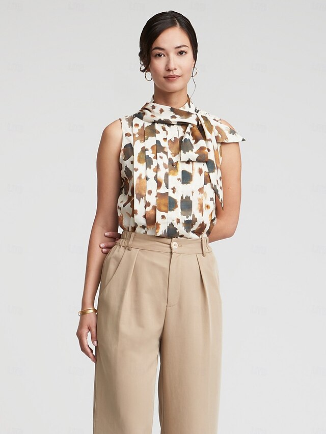 HOT ! Sleeveless Pleated Button Front Bow Neck Blouse