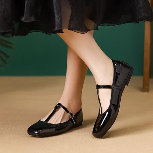 Women's Patent Leather Mary Jane Flats Square Toe Ballet Shoes with T-Strap Design Comfort Light Versatile Dressy-Casual Footwear for Work Parties & Walking