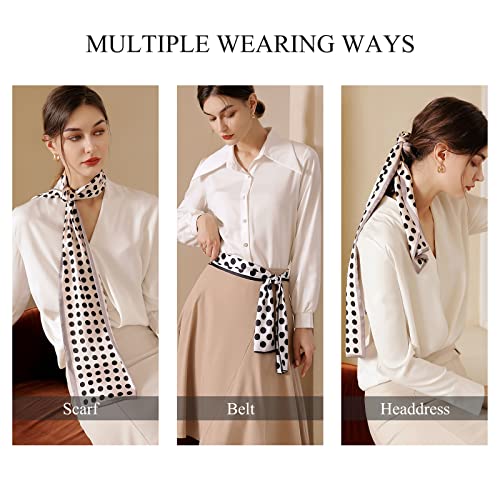 • MULTIPLE WEARING WAYS: Elegant and versatile, the skinny scarf can be worn in various ways. Braided into your hair or used as a headband, it flatters face shape and adds highlights to your hairstyle. Tie a bow around your neck as a neckerchief, it can fill in the blanks in the neck and perfectly modify the neck line. As an embellished accessory, it can be tied around the wrist, around the waist or even used as a handle wrap. The novel and chic collocation highlights the exquisite life concept.