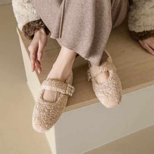 Kluolandi Women's Shearling Ballet Flats with Strap Warm Rabbit Fur Lined Crystal Buckle Mary Jane Flat Shoes 5