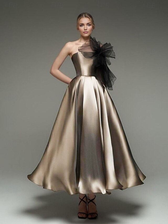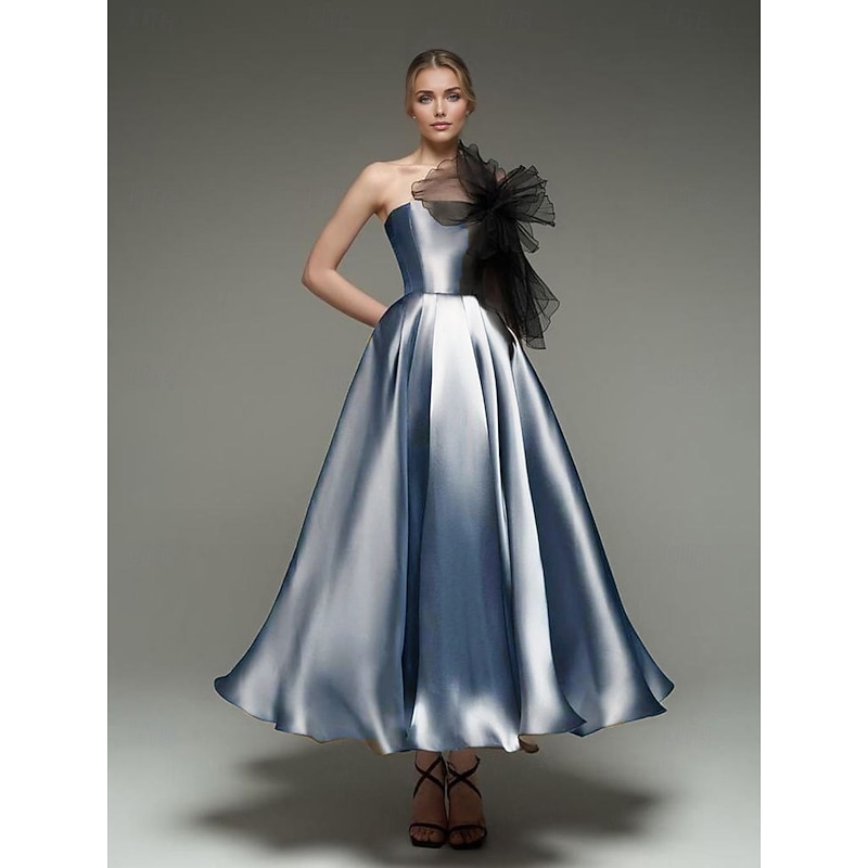 HOT ! A-Line Cocktail Dresses Elegant Gown Formal Wedding Tea Length Midi Length Sleeveless Strapless Organza with Shouder Flower and Pockets