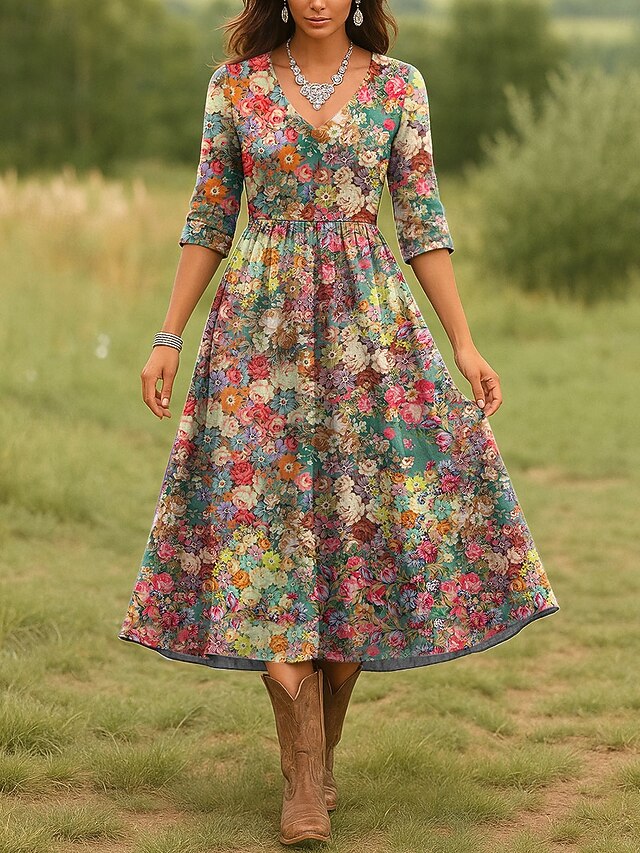 Women's Midi Dress Casual Dress A Line Dress Vacation Casual Regular Fit Floral Graphic 3/4 Length Sleeve V Neck Pink Red Navy Blue Blue Spring Fall 13