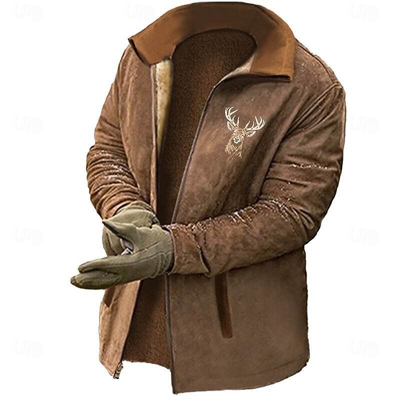 : The sweatshirt features a distinctive full zip closure and a stand collar, providing both style and practicality. The standout 3D printed deer pattern on the chest adds a unique, rustic charm to its overall look.