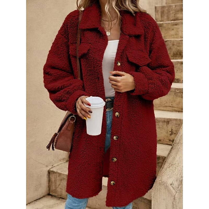 More information about Women's Sherpa Jacket Comfortable Breathable Pocket Buttons Casual Plain Vacation Street Casual Daily Wear Single Breasted Long Turndown Loose Fit Long Sleeve Outerwear Black White Red Spring Fall