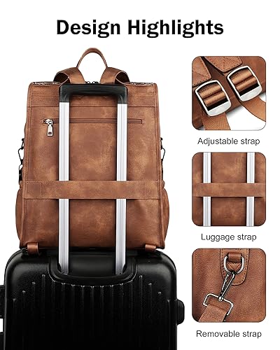 FADEON Leather Laptop Backpack for Women, Designer Ladies Work Travel Computer Backpack with Laptop Compartment Purse Brown 6